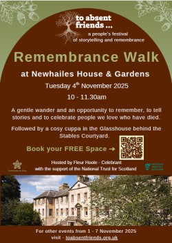 This activity will begin with a walk in their grounds with a few pauses for reflection - one to read a short poem, one to write names onto leaves to float downstream or scatter into the wind, and the last one to hold a short 5-senses meditation in the shell grotto - with the opportunity to add a shell to the grotto, which is a remembrance monument in the grounds of Newhailes House. This will be followed by a cuppa and a chance to chat in the Glasshouse.